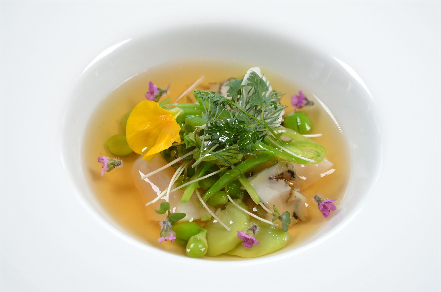 春の豆類とツブ貝、帆立のコンソメゼリー寄せ